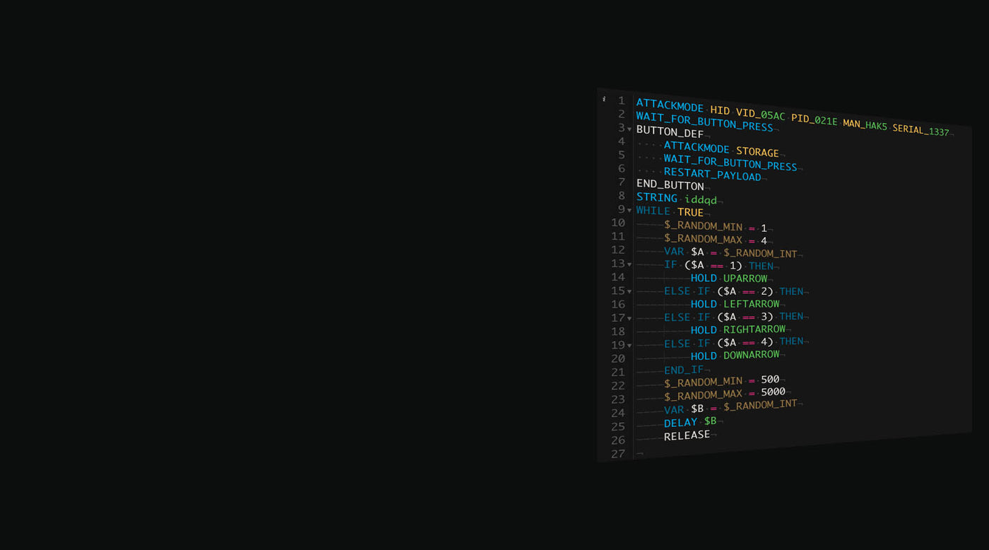 Mimic human typing cadence. File system spoofing hides loot & injection files. Even detect storage activity to detect device activity — all in simple DuckyScript.