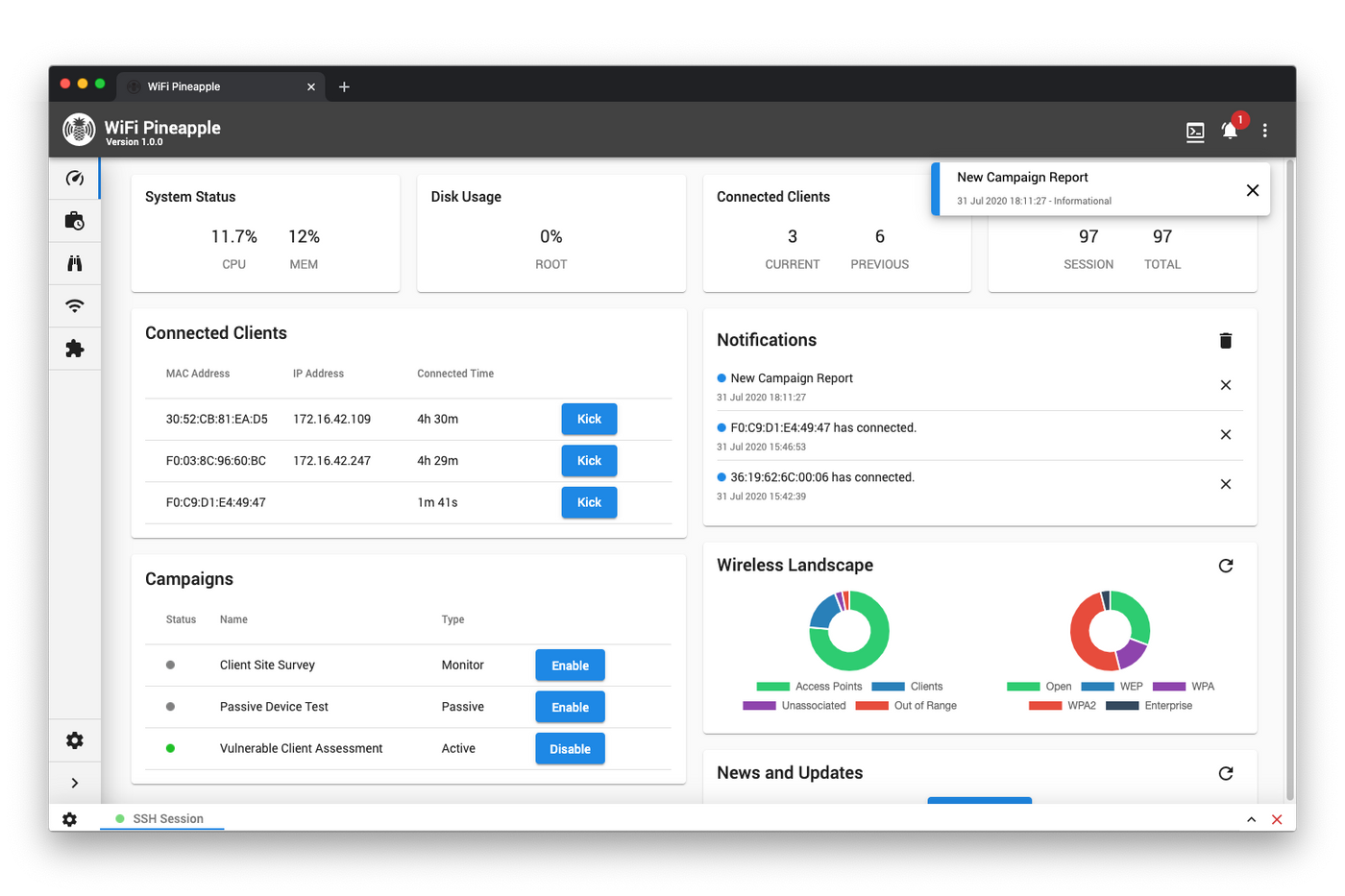 Automate WiFi auditing with all new campaigns and get actionable results from vulnerability assessment reports. Command the airspace with a new interactive recon dashboard, and stay on-target and in-scope with the leading rogue access point suite for advanced man-in-the-middle attacks.